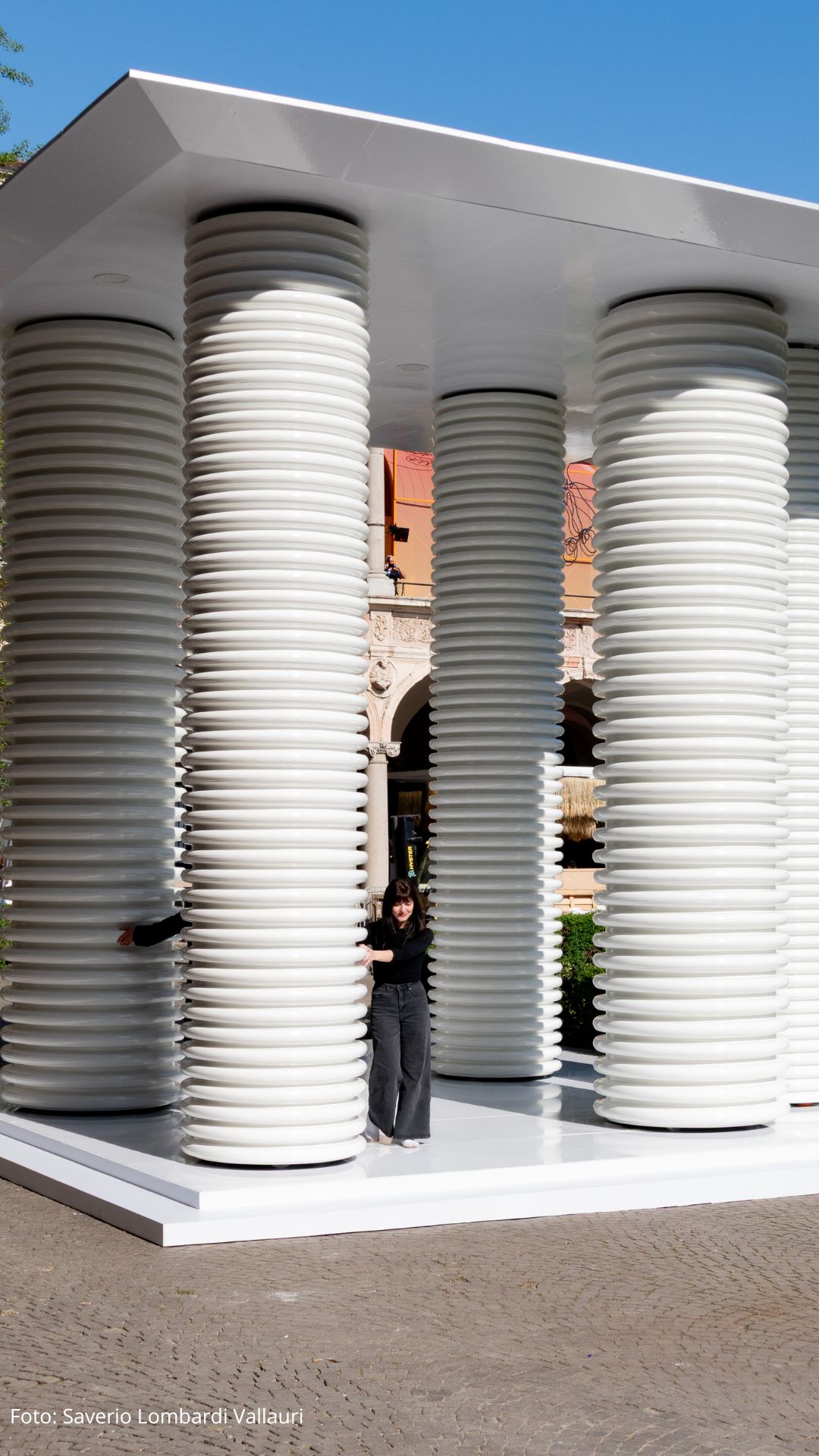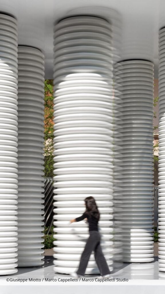 Un tempio di colonne bianche realizzate in plastica riciclata diventa, infatti, un organismo trasformabile e dinamico grazie all’azione dei visitatori, stimolando sia la riflessione personale che la condivisione collettiva.